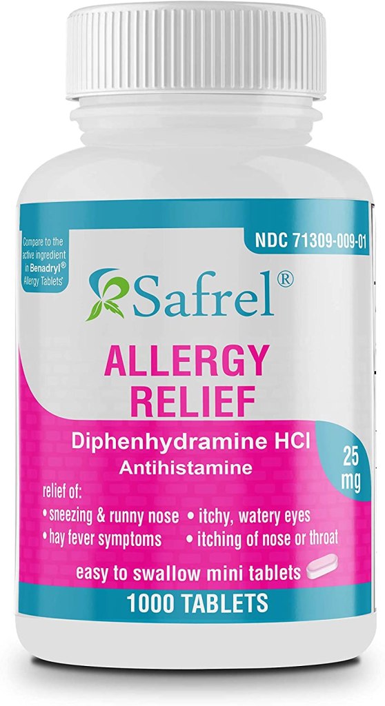 Many generics and store-brand versions of diphenhydramine are on the market, usually labeled “Allergy Relief” or “Sleep-Aid.” Some of these come in 50 mg sizes, so read the labels carefully.