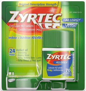 Zyrtec (cetirizine) is available in a 10 mg tablet as well as generics. Claritin (loratadine) comes in a 10 mg tablet or chewable tablet. Children’s Claritin comes in a liquid or a chewable 5 mg tablet. Allegra (fexofenadine) comes in a fairly large 180 mg tablet or a Children’s strength 30 mg tablet. Generics for both Claritin and Allegra are also plentiful.
