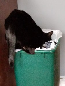 As I’m writing this, one of my cats just knocked over the office trash can (see photo). So it’s not just dogs.