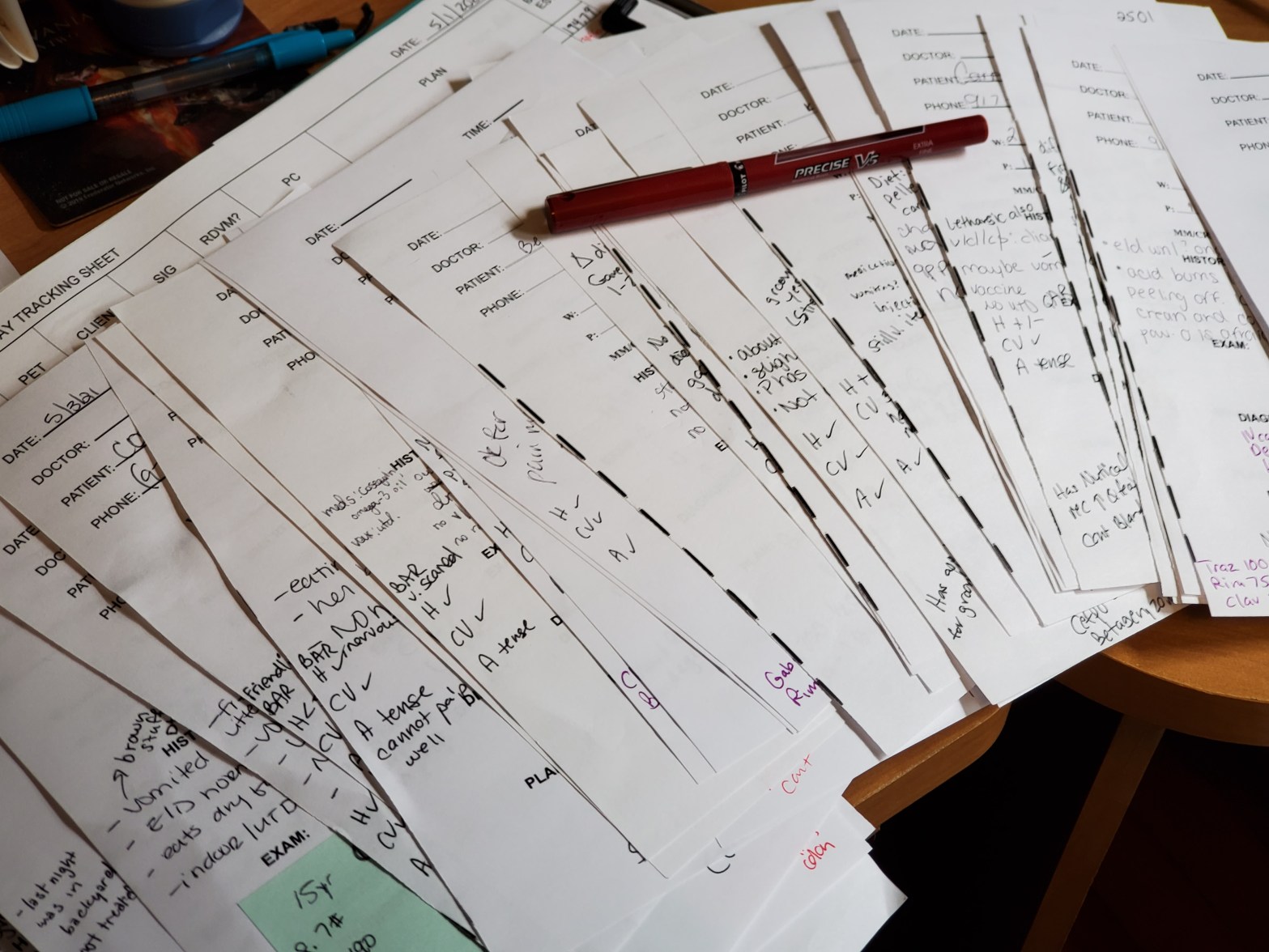 Emergency veterinarians at most hospitals work a 12-hour shift, give or take a few hours. That time is generally all spent seeing patients, managing in-patients, doing procedures, or working on other doctor-y things, like returning phone calls, calling about patient test results, updating clients about hospitalized pets, or writing hospital discharge instructions. Once all ofContinue reading “After a Shift Ends, the Paperwork Begins”